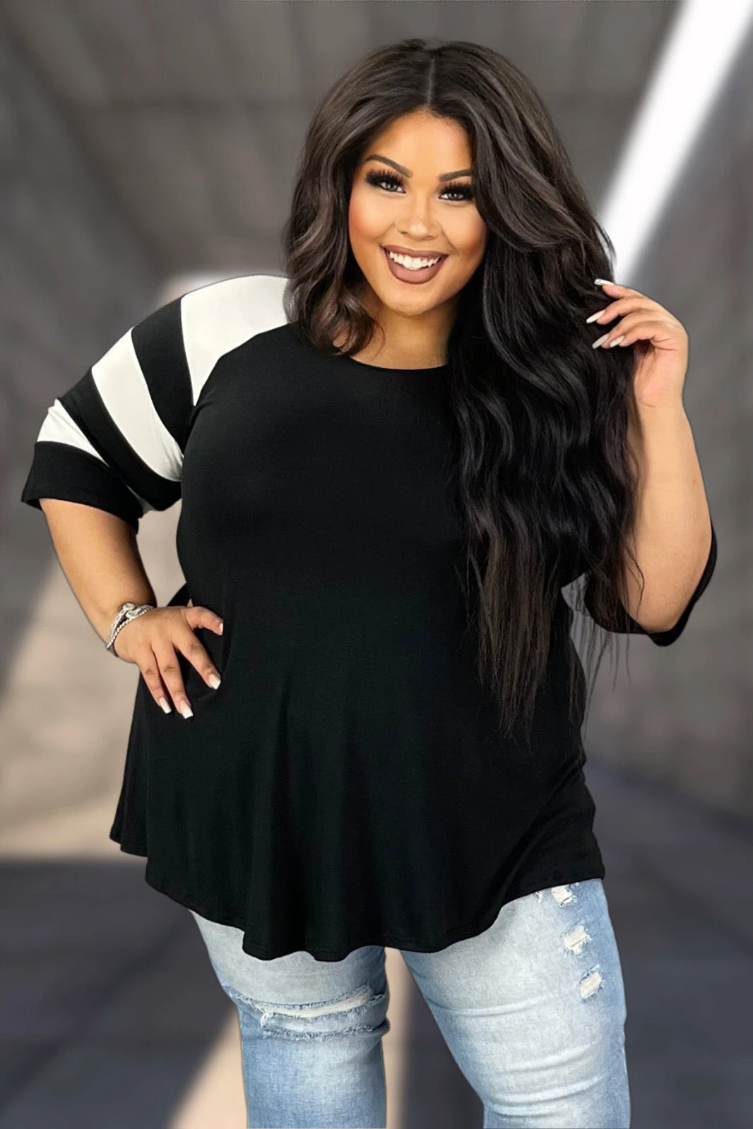 11 CP-A {Curvy Hanging Out} Black Tunic W/Striped Sleeve CURVY BRAND!!! EXTENDED PLUS SIZE XL 2X 3X 4X 5X 6X