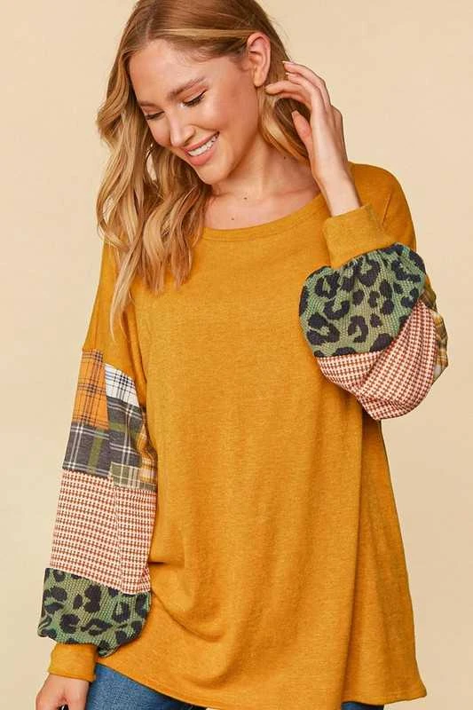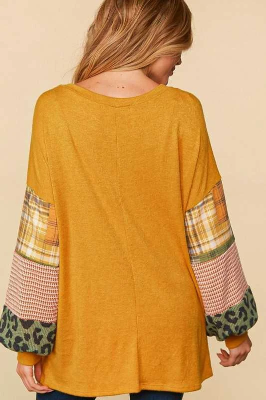 12 CP {Secret Love} Mustard Top W/Multi-Print Sleeves PLUS SIZE XL 2X 3X