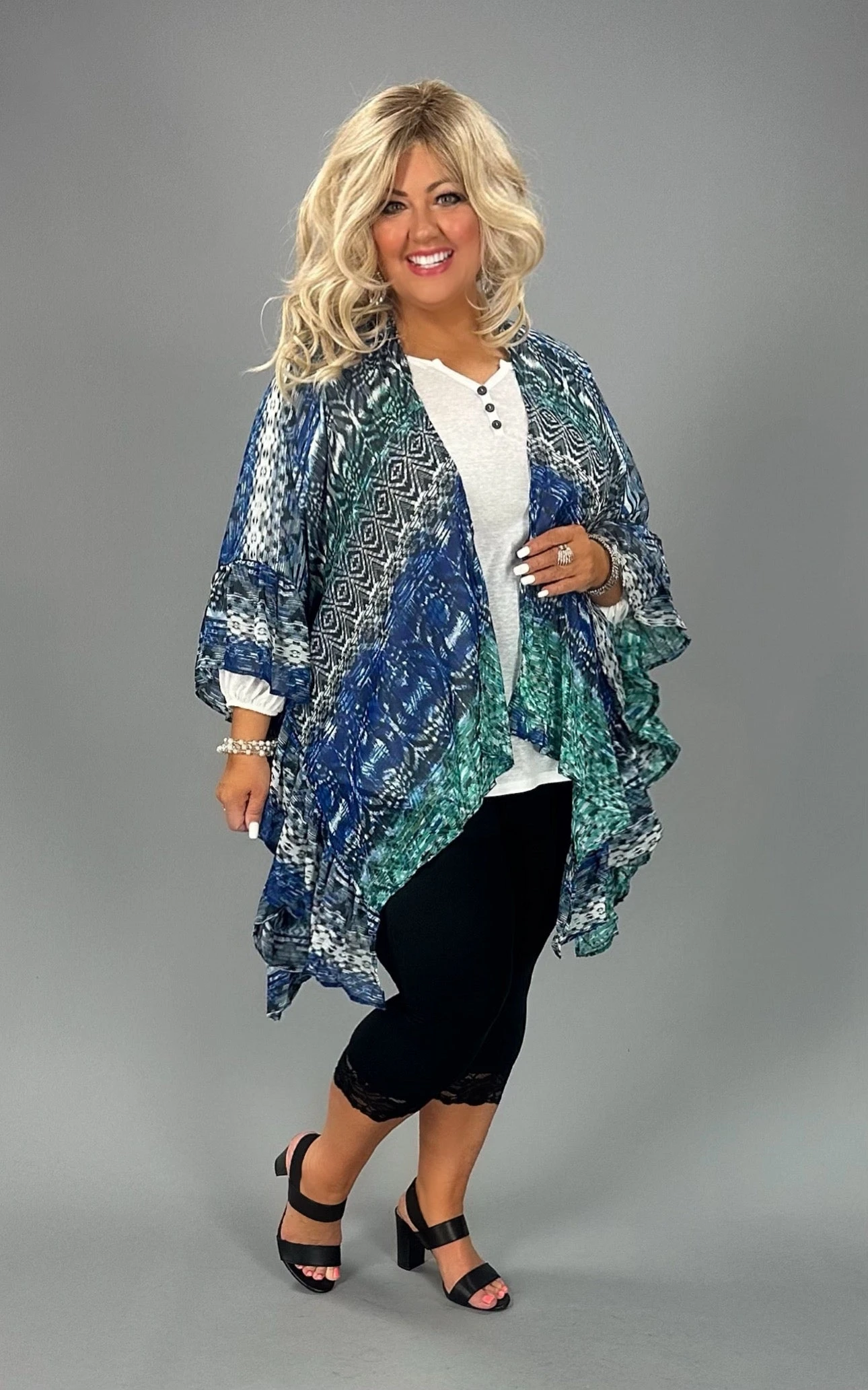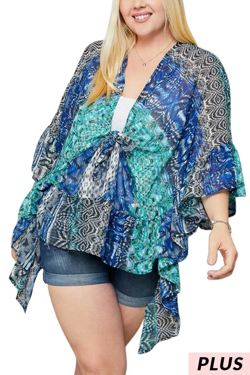 19 OT-T {On A Good Day} Royal Blue Print Ruffle Kimono PLUS SIZE 1X/2X 2X/3X