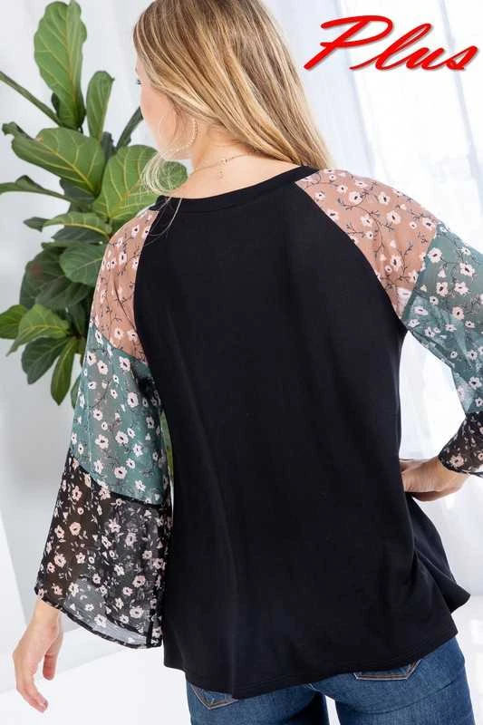 23 CP {Put Worries Aside} Black Top W/Floral Sleeves PLUS SIZE 1X 2X 3X