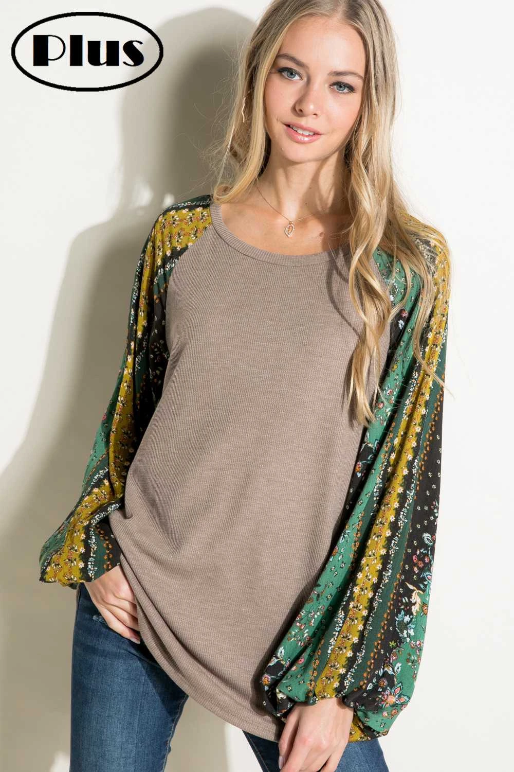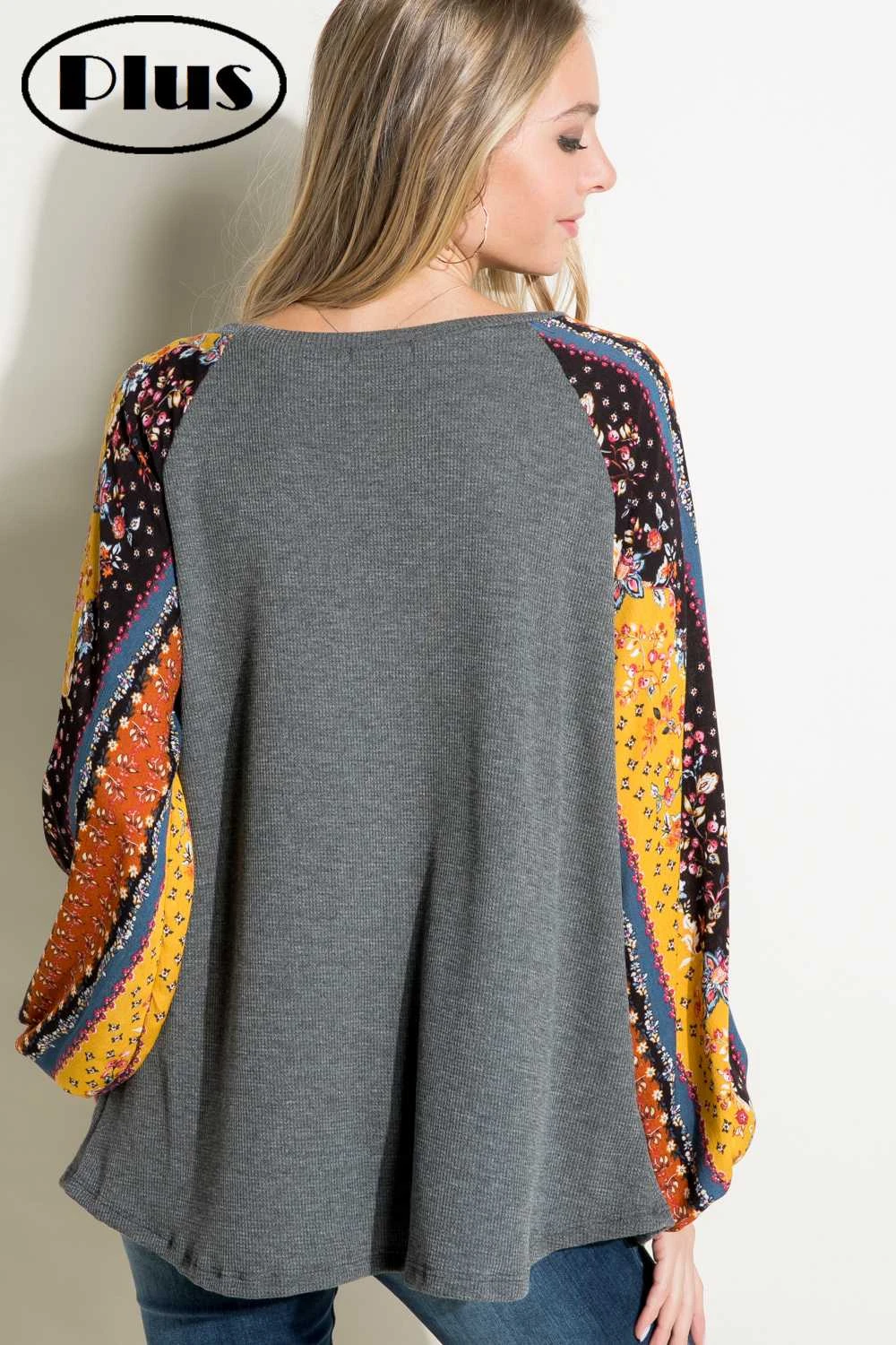 26 CP {Savor The Feeling} Charcoal Top W/Floral Sleeves PLUS SIZE 1X 2X 3X