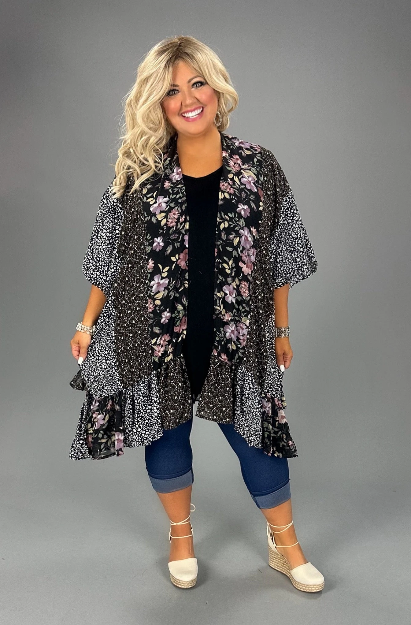 34 OT-L {I Am Here} Umgee Black Mulit-Print Kimono PLUS SIZE XL/1X 1X/2X