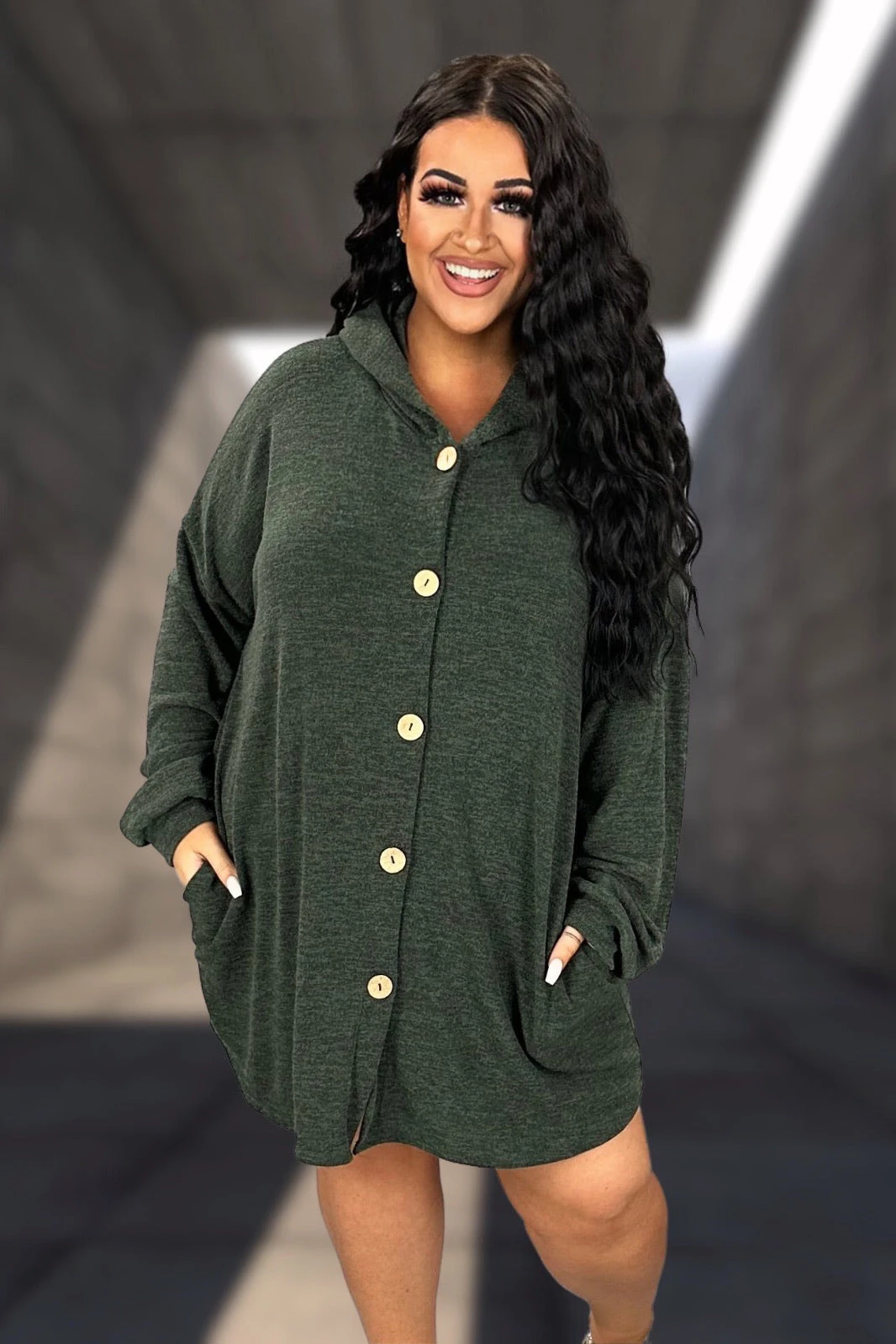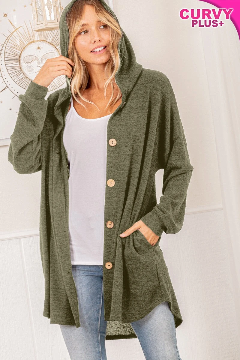 36 OT {Embrace The Chill} Olive Button Up Cardigan W/Hood PLUS SIZE 1X 2X 3X