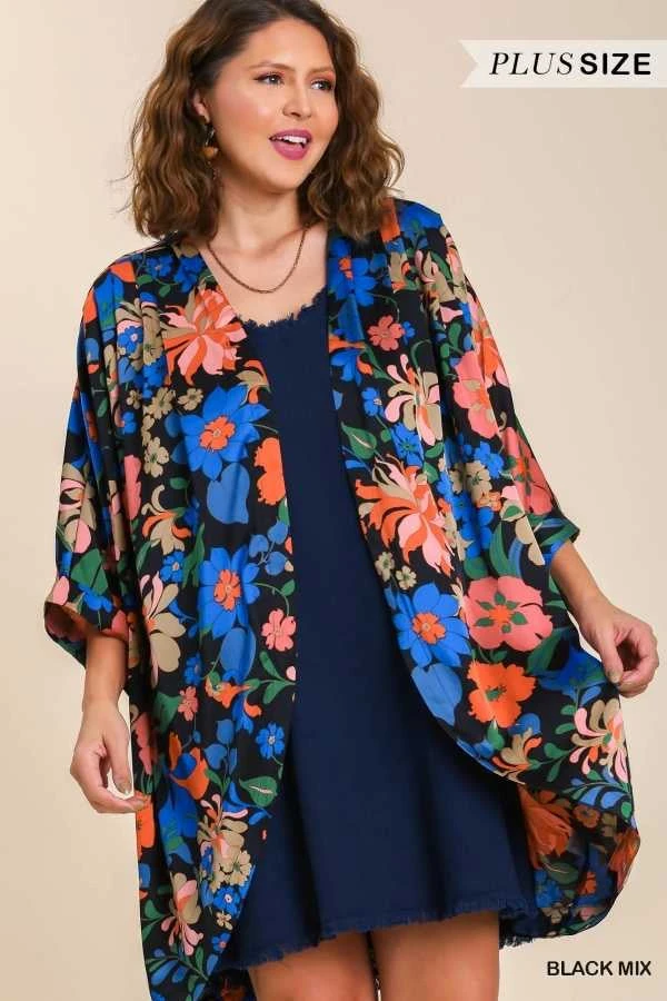 44 OT-A {Vibrant Vibes} Umgee! Black Mix Floral Kimono PLUS SIZE XL/1X 1X/2X