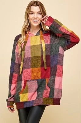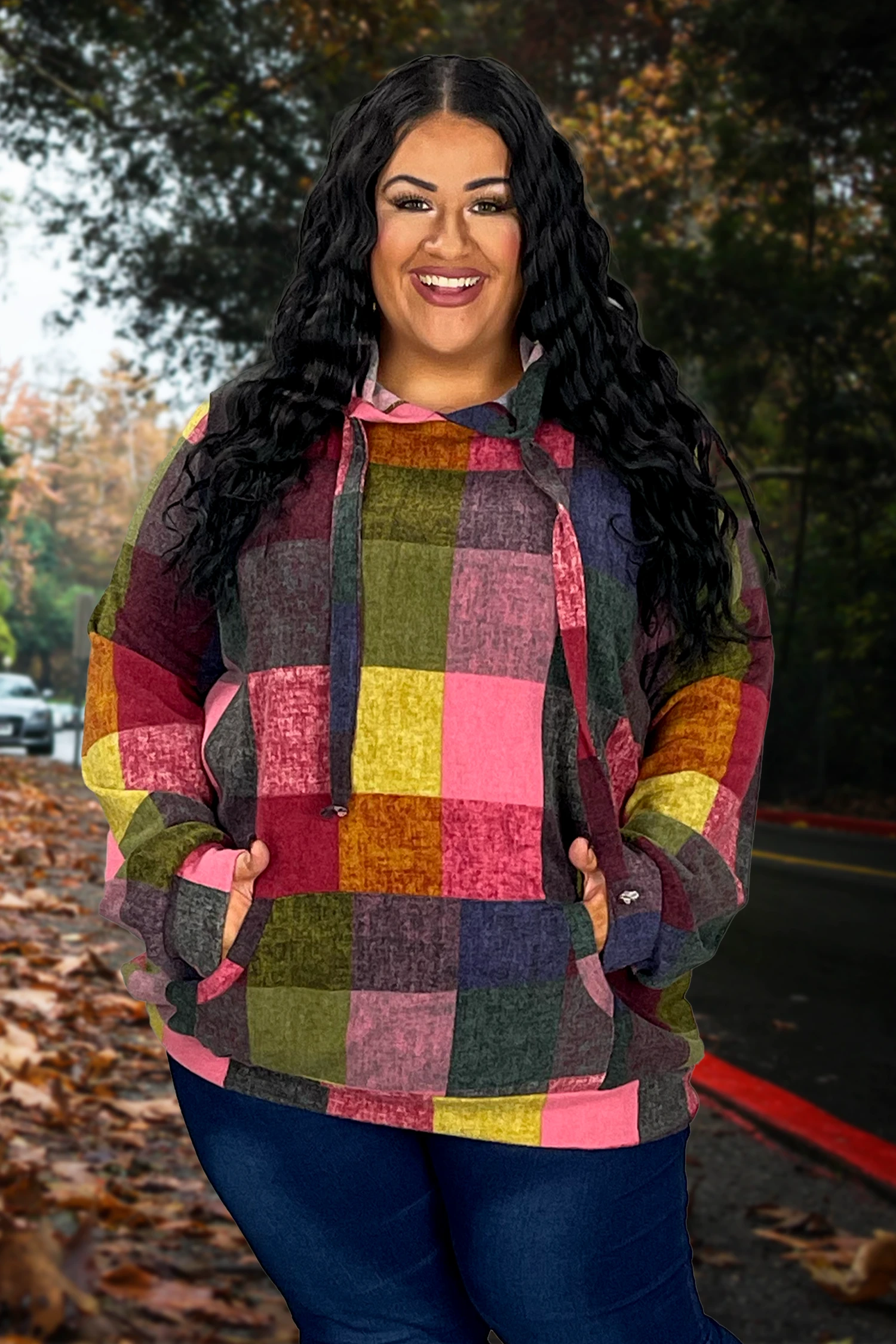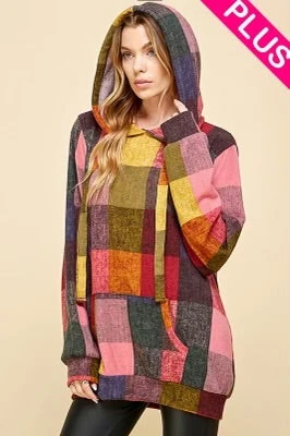 56 HD-D {Get On Board} Red/Pink Plaid Hoodie PLUS SIZE 1X 2X 3X