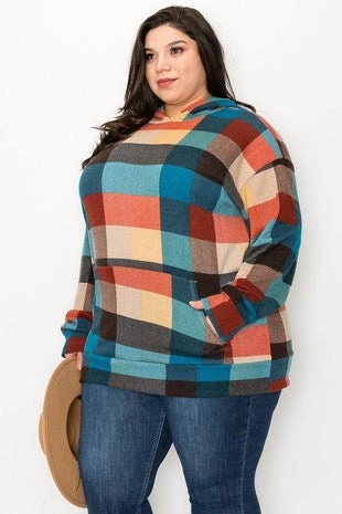 87 HD-B {Double Take} Multi-Color Plaid Hoodie W/Pocket EXTENDED PLUS SIZE 3X 4X 5X