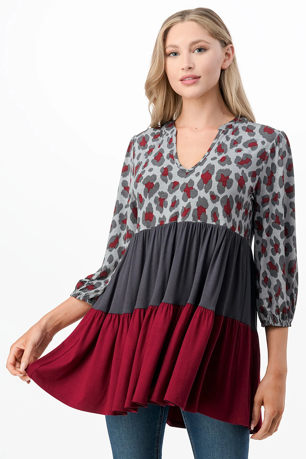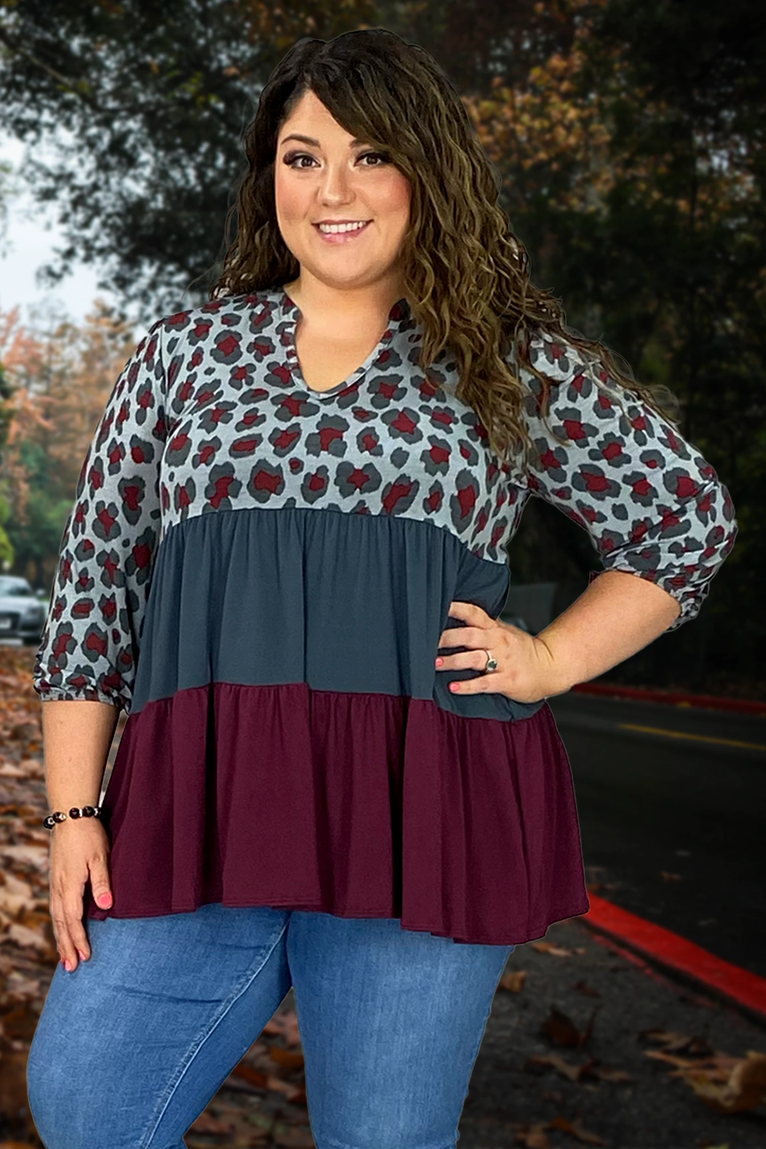 90 CP-A {Make Me Believe} Grey/Burgundy Leopard Tiered Top PLUS SIZE 1X 2X 3X