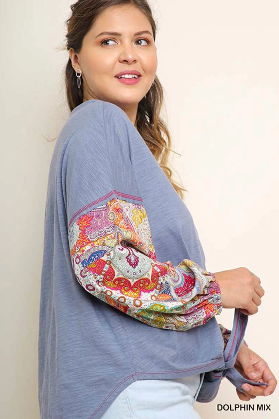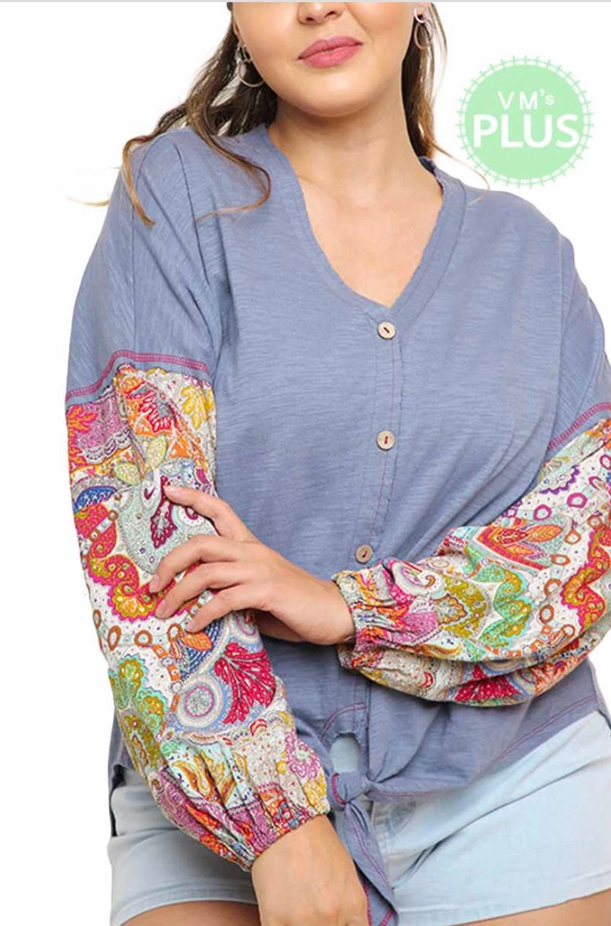 {Before I go} “UMGEE” Blue Top with Printed Sleeves