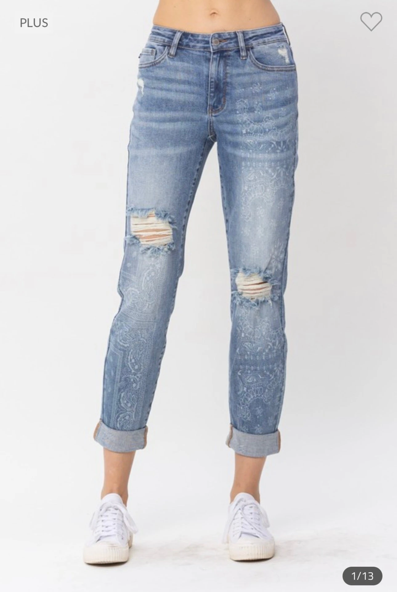 LEG-78 {Judy Blue} Medium Destroy & Paisley Print Jeans EXTENDED PLUS SIZE 16W 18W 20W 22W 24W